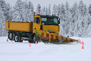 Heavy trucks are used to plow the roads and highways and they can grit or salt the road at the same time too. This photo shows some driver testing his skills with the snow plow.